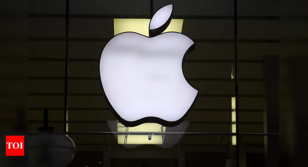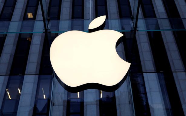 SUBMIT IMAGE: The Apple Inc logo design is seen hanging at the entry to...